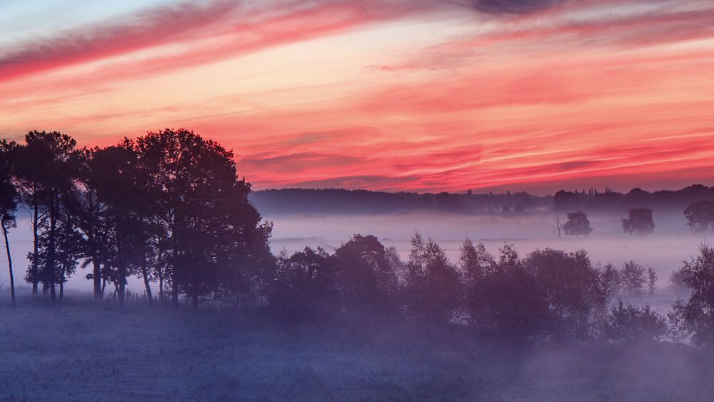 ciel rouge et bleu au lever du soleil sur un wetland_1 brumeux par Tony Vingerhoets
