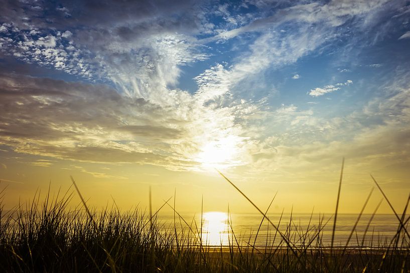 coucher de soleil, le sac de soleil jaune dans la mer et que vous pouvez voir depuis les dunes, à travers l'herbe dunaire