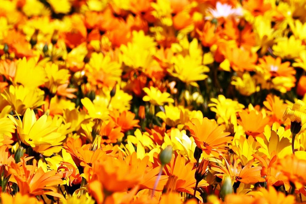 Gros plan sur une prairie avec des fleurs de capucine orange et jaune