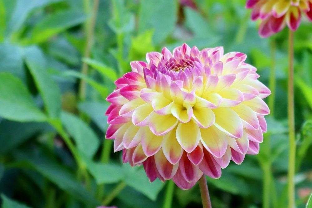 Dahlia rose avec un cœur jaune dans le jardin de sculptures de Keukenhof