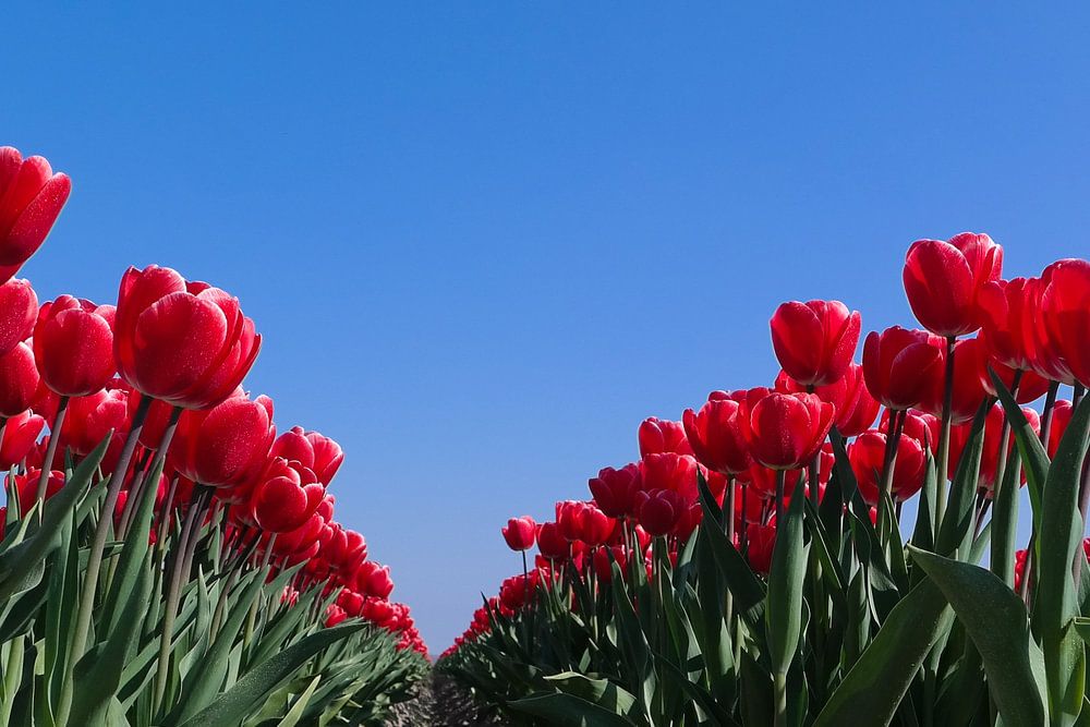 rode tulpen zijn de kleur van de liefde, zo mooi in een rij op de akker