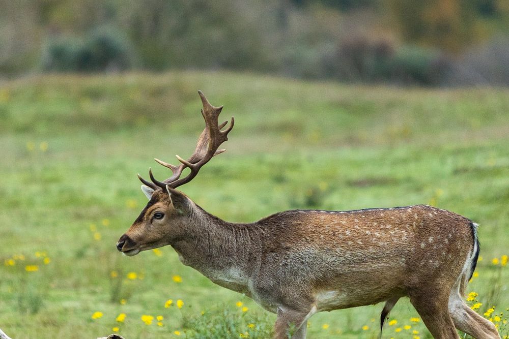 des cerfs marchant calmement près des arbres et des branches mortes. Ce cerf a traversé un champ à l'aise, sans se soucier des gens et des autres cerfs qui l'observaient.