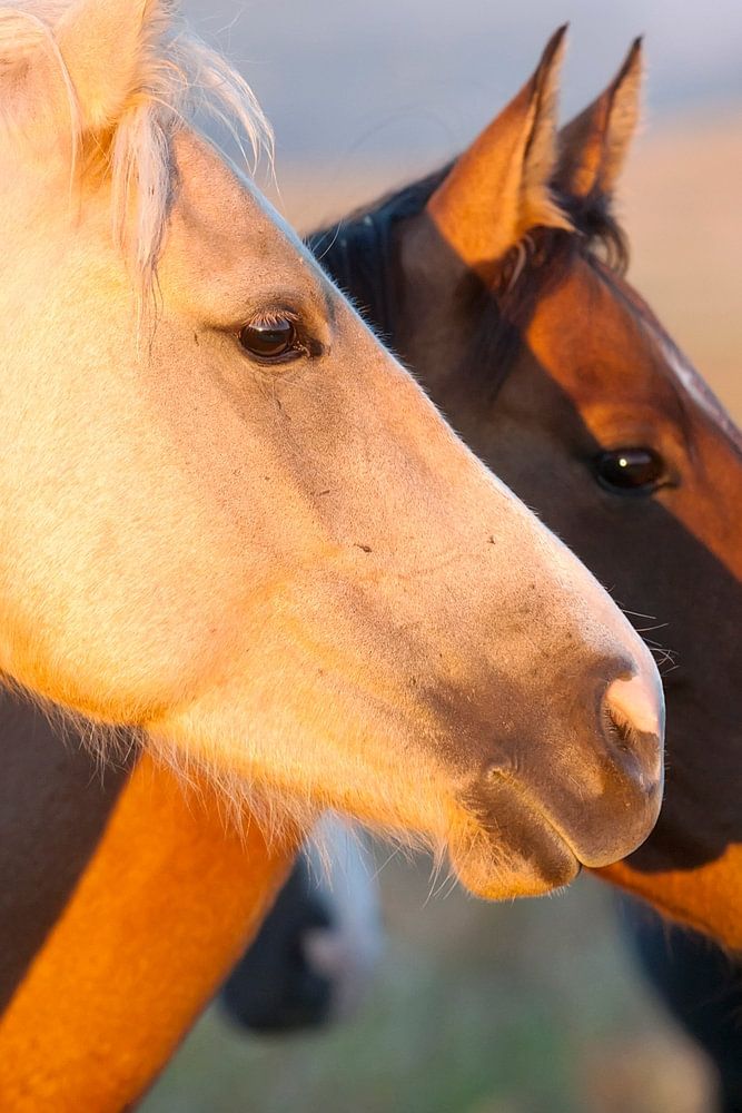 Têtes d'un cheval blanc et d'un cheval brun. Les chevaux vivent dans le Dakota du Sud, au refuge pour chevaux sauvages.