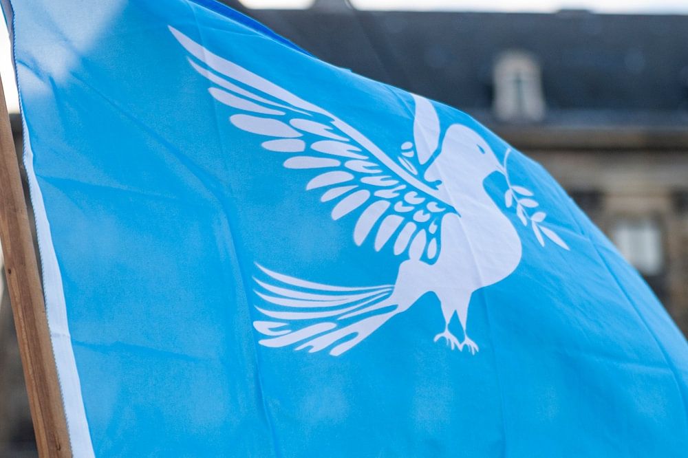 Amsterdam, Pays-Bas, 29 octobre 2023. En l'absence notable de drapeaux nationaux ou d'autres accessoires orientés vers un pays, des milliers de personnes marchent en silence dans le centre d'Amsterdam pour manifester en faveur de la paix. Alors que la guerre se poursuit entre l'Ukraine et la Russie et entre Israël et la Palestine, la marche appelle à la fin de toutes les hostilités. Parmi les drapeaux présents, une colombe blanche avec un rameau d'olivierpaix, marche pour la paix, manifestation, manifestation, rameau d'olivier, colombe, blanc,
