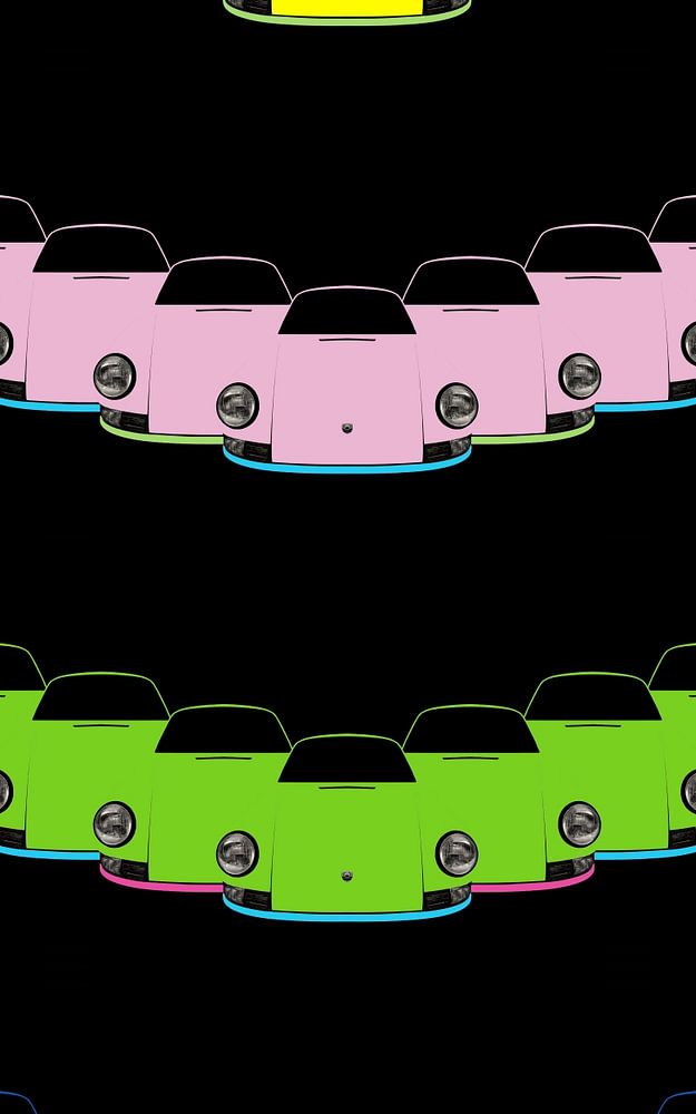 Une vieille voiture de sport, artistiquement détournée numériquement, devient un compagnon de route dynamique par sa couleur et sa forme. La voiture apparaît dans différentes couleurs vives et déformées - tantôt rouge vif, tantôt bleu profond ou jaune criard, chaque version étant superposée à des motifs abstraits et à une texture numérique. Les lignes classiques de la voiture sont en partie déformées, étirées ou fragmentées, tandis que les couleurs se fondent les unes dans les autres avec fluidité, ce qui confère à l'image une esthétique futuriste et surréaliste. La voiture de sport devient ainsi un symbole de mouvement, de vitesse et d'intemporalité, flottant entre la réalité et l'imagination numérique.