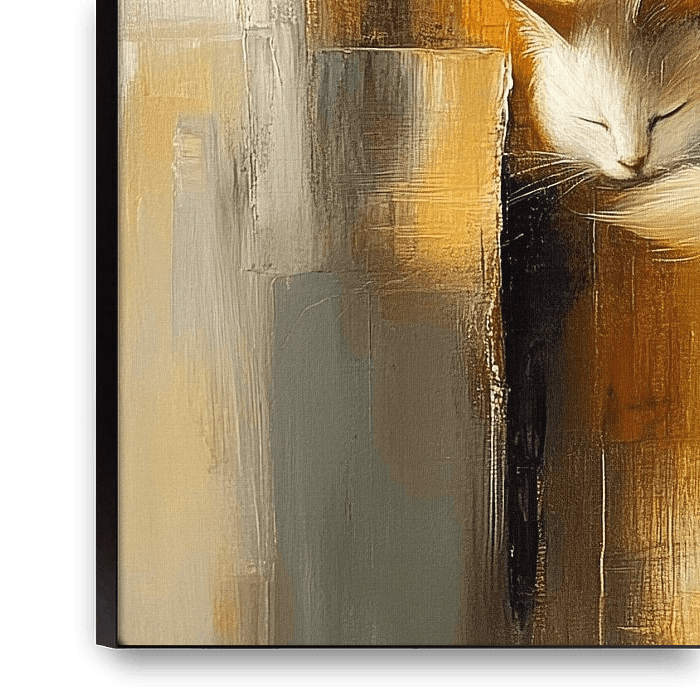 Convient aux chambres à coucher, aux salons ou aux coins bien-être. Vous cherchez un 'art abstrait de chat dans des tons chauds' ou un 'art mural animalier serein' ? Cette pièce est un must pour 'l'art contemporain or' et 'la décoration murale chaleureuse'.
