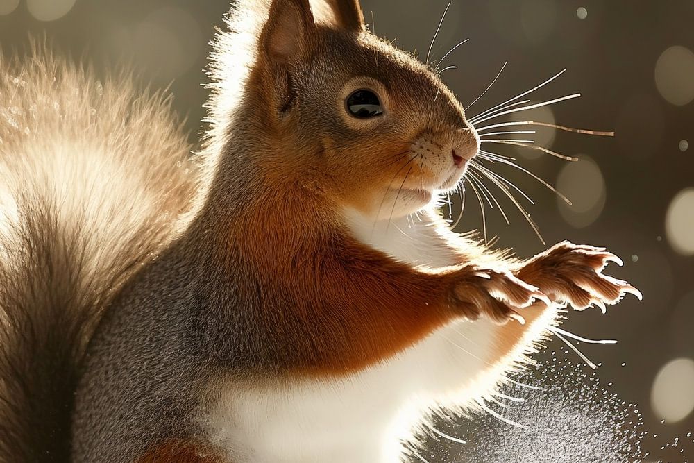 Écureuil sur fond de bokeh hivernal. Portrait d'un écureuil dans un paysage hivernal. Photographie animalière écureuil.
