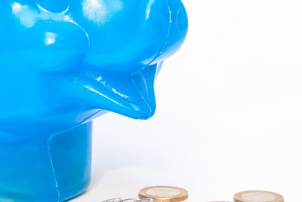 een plastic blauwe spaarvarken met euromunten om te sparen voor een appel voor de dorst