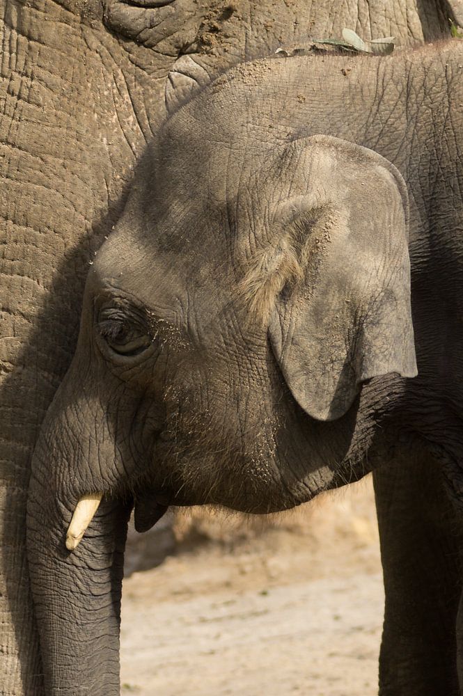 Un jeune éléphant cherche du réconfort auprès de sa mère, avec les tuyaux ensemble, ils montrent leur amour.