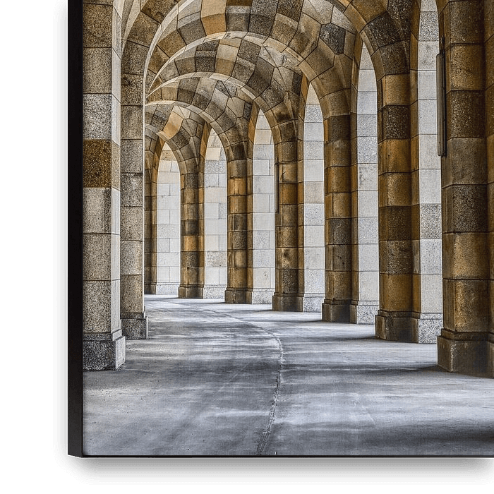 Une arcade monumentale et symétrique en pierre massive qui impressionne par sa précision géométrique et sa profondeur. Les arcs, soutenus par de robustes piliers, s'étendent au loin et créent une perspective impressionnante qui attire profondément l'observateur dans le tableau. Les arcs en pierre sont peints dans différentes teintes de…