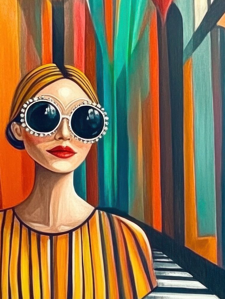 Cette œuvre d'art colorée et moderne se caractérise par des formes expressives et des contrastes de couleurs audacieux. Une femme portant des lunettes de soleil dans une robe rayée dans une palette d'orange et de turquoise apporte de l'énergie et un attrait visuel à n'importe quel espace. La femme dans une rue colorée donne à l'œuvre un aspect contemporain qui s'intègre bien dans les intérieurs modernes.