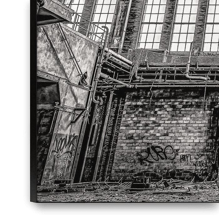 incorporation en noir et blanc de fenêtres et de chaudières ou de turbines dans une centrale électrique abandonnée près de Charleroi, Belgique