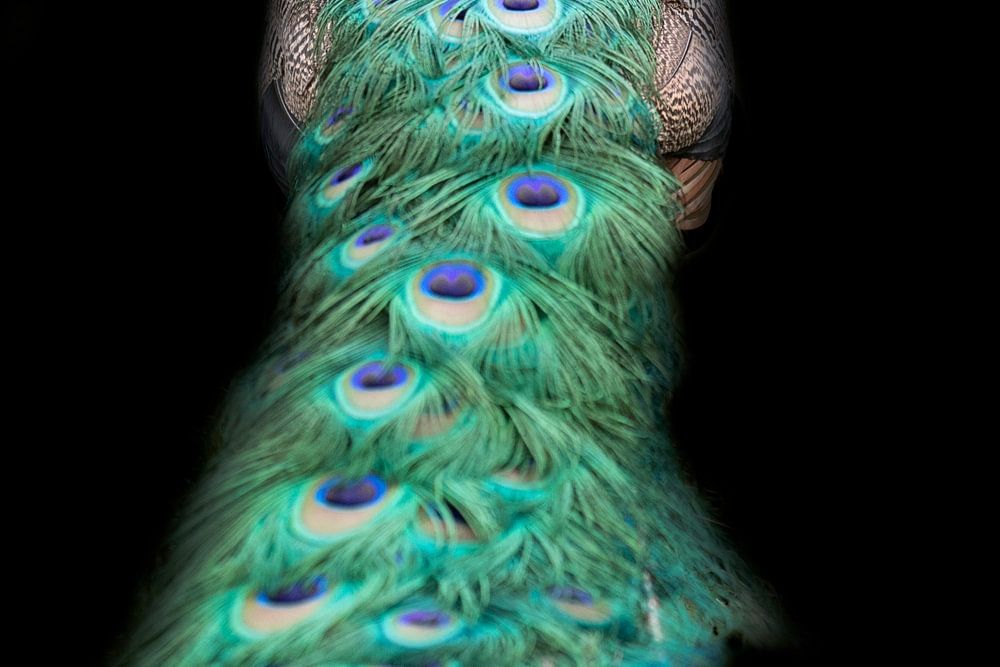 Une vue magnifique des belles plumes d'un paon mâle. Les plumes se drapent sur le sol, créant ainsi une image artistique.