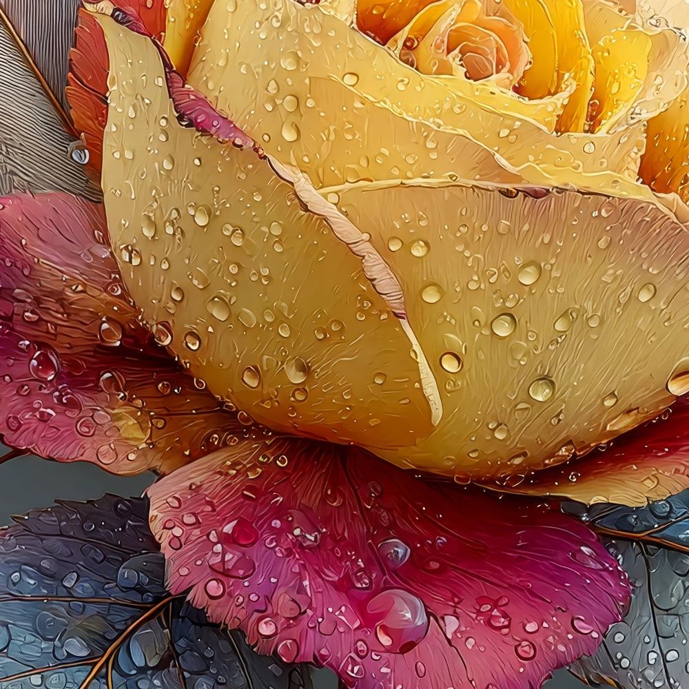 De gele bloemen stralen warmte en optimisme uit; de waterdruppels vangen licht en geven tactiele diepte; subtiele ijsrandjes voegen een frisse, bijna magische spanning toe.