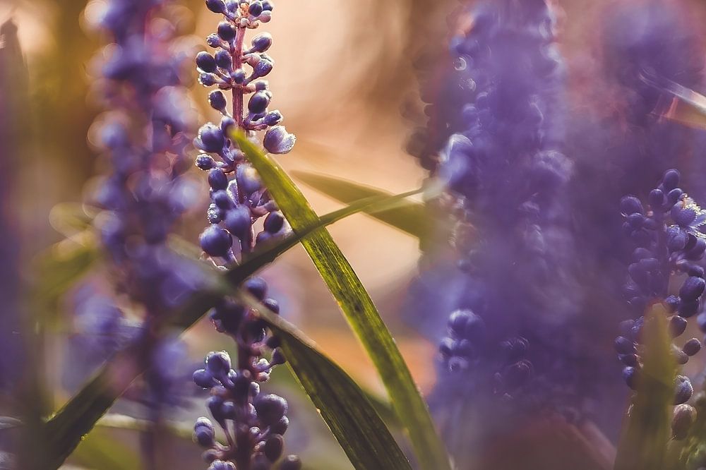 Gros plan de Liriope muscari, ou herbe à nénuphars, avec un post-traitement de photo lunaire et un arrière-plan bokeh ensoleillé.
