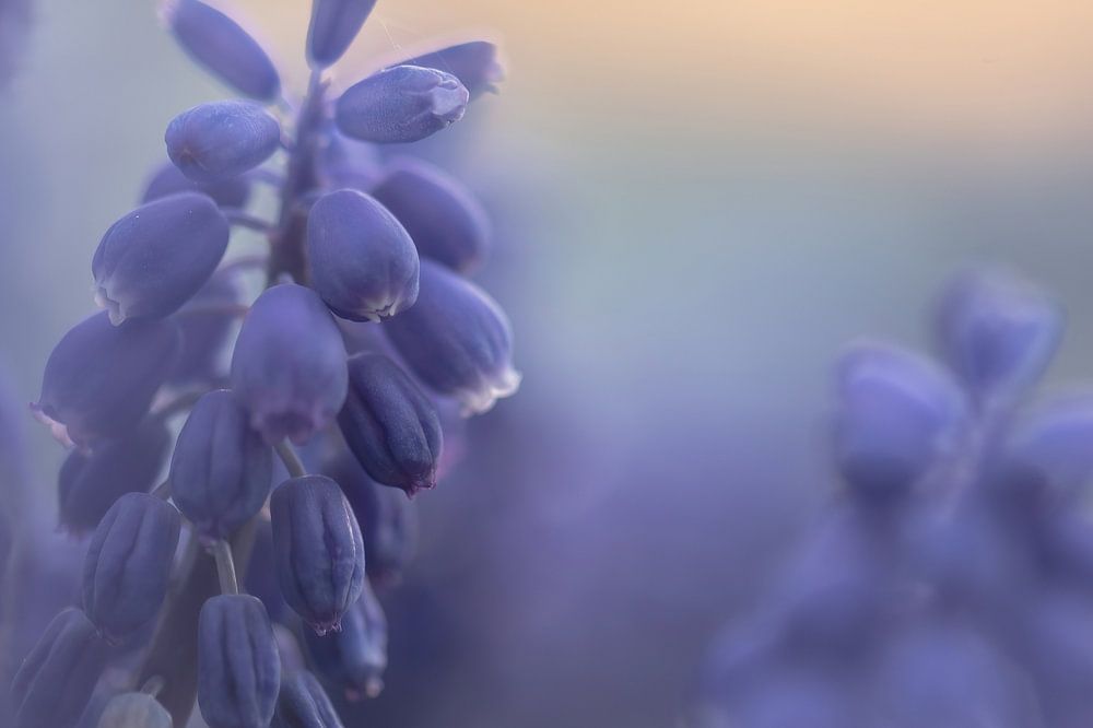 Gros plan de quelques muscari, ou raisins bleus, avec une finition photo douce, et la lumière chaude et douce du soleil levant en arrière-plan.