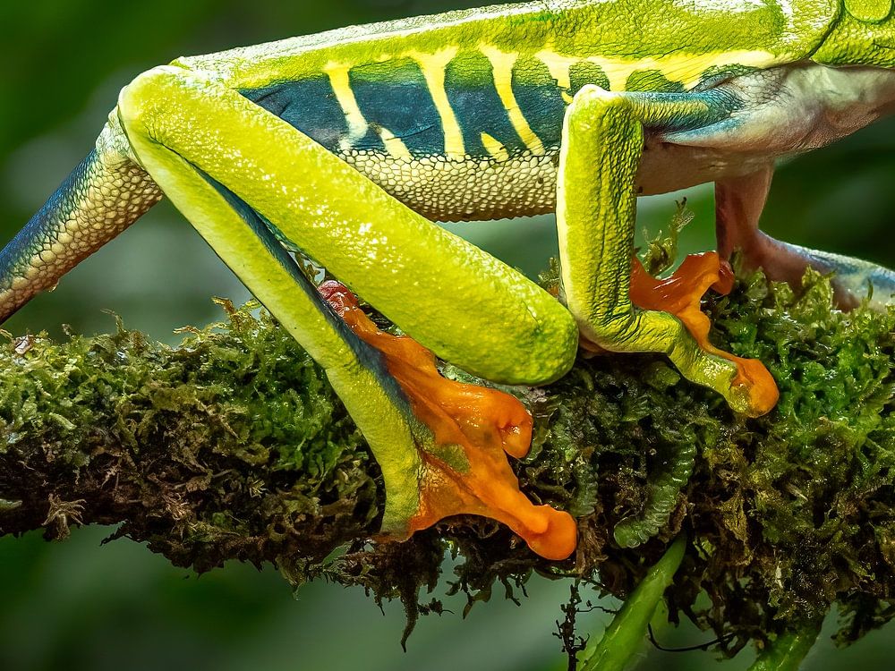 Comme si elle n'était pas réelle : une grenouille arboricole du Costa Rica aux pattes incroyablement longues et à la palette de couleurs époustouflante. Des pattes orange, des flancs bleus, un corps jaune-vert et des yeux rouge vif - on dirait qu'elle est en plastique. Cette photo a été prise dans la forêt tropicale du Costa Rica, au cours d'un voyage où nous cherchions surtout des oiseaux.