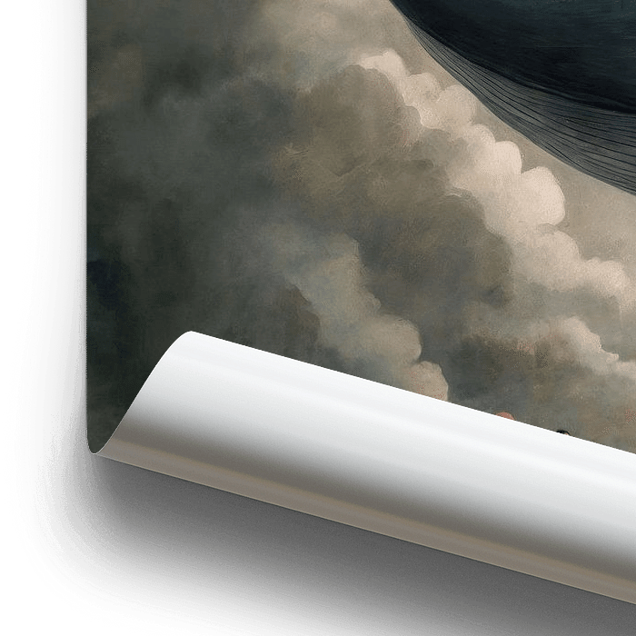 L'enfant au ballon se détache sur le ciel sombre et nuageux, conférant à la scène une atmosphère surréaliste et onirique. La mer est agitée, les vagues s'agitent sous la baleine, mais l'enfant semble calme et serein, comme s'il profitait de la magie du moment.