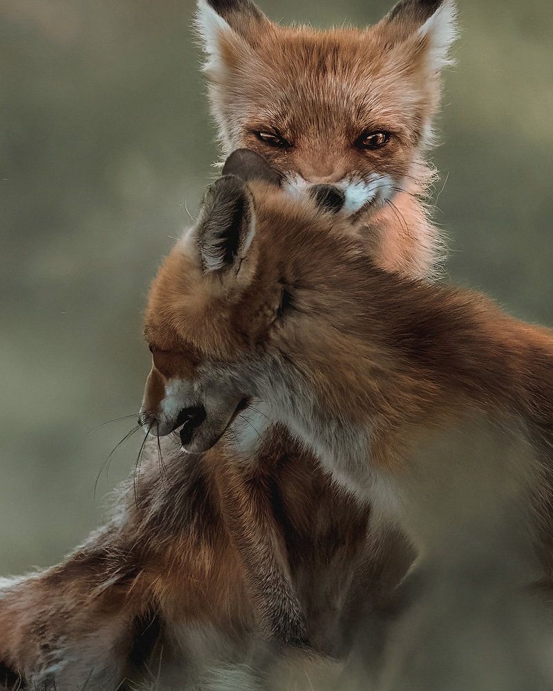 Jouer les renards avec une expression surprenante . Cette photo a été prise dans les dunes d'approvisionnement en eau d'Amsterdam. Un soir, j'ai vu ces renards jouer dans la douce lumière du soir. Mon regard s'est immédiatement porté sur le renard du milieu qui avait une expression faciale sûrement unique au moment de l'impression. Cette photo est l'une de mes préférées dans mon portfolio. En tant que photographe animalier, je peux dire que les renards sont mon sujet de photographie préféré. La photo est un arrêt sur image avec une vitesse d'obturation rapide.