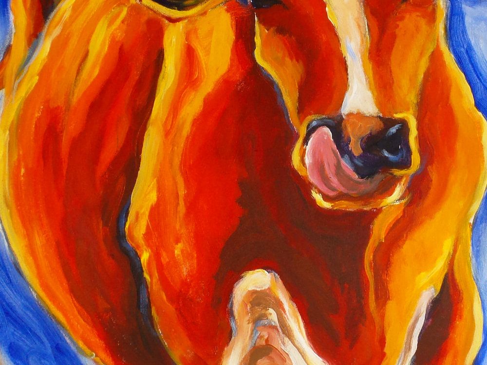 Vrolijk schilderij van koe in blauw en rood. Het origineel is geschilderd met acrylverf op doek.