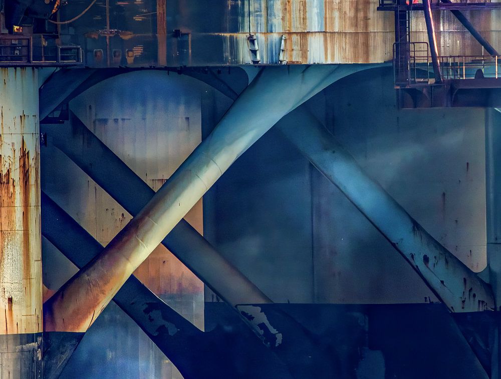Ce sont les couleurs qui font la particularité de cette image : toutes les nuances de bleu imaginables, combinées à des couleurs chaudes de rouille allant de l'ocre brûlé à l'orange profond. La lumière rasante donne un relief supplémentaire à chaque détail ; elle rend visibles des tubes qui disparaissent normalement dans l'ombre et éclaire la structure du navire comme s'il s'agissait d'une sculpture.