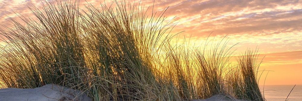 Une belle image panoramique d'un paysage de dunes néerlandaises pendant un coucher de soleil avec également une vue de la mer du Nord et de la plage.