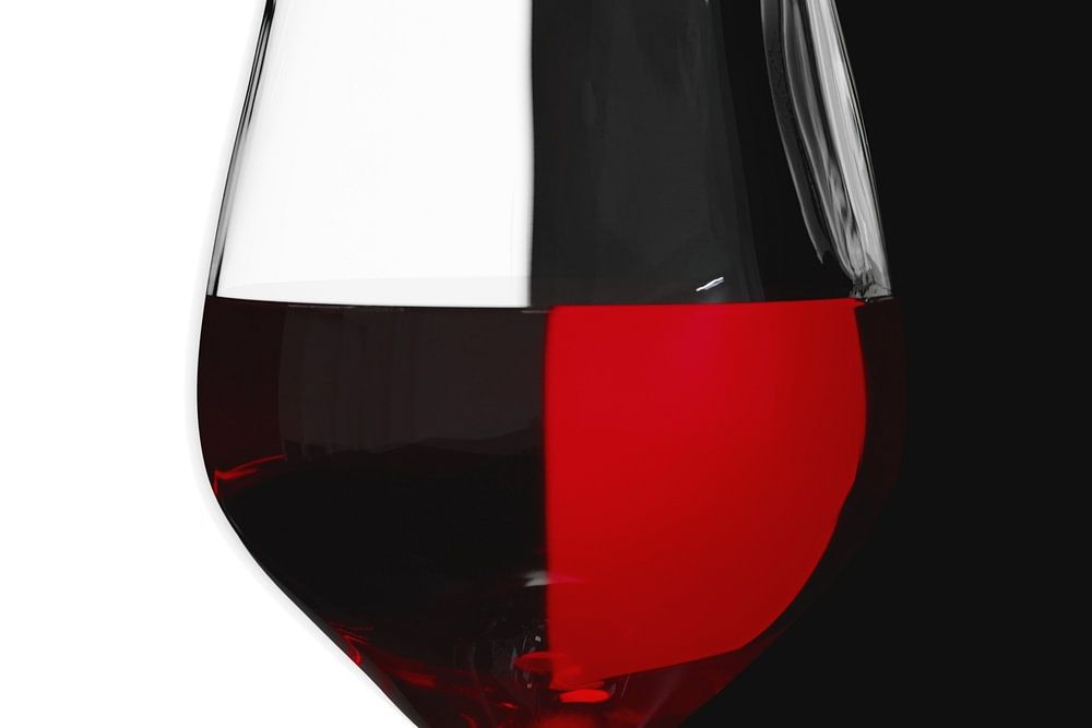 Verre à vin avec du vin rouge sur fond noir et blanc.