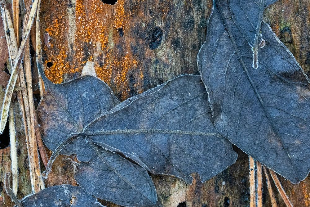 Un arbre mort en hiver, avec des feuilles mortes. Couvert de champignons colorés et criblé de trous d'insectes. Une source de vie
