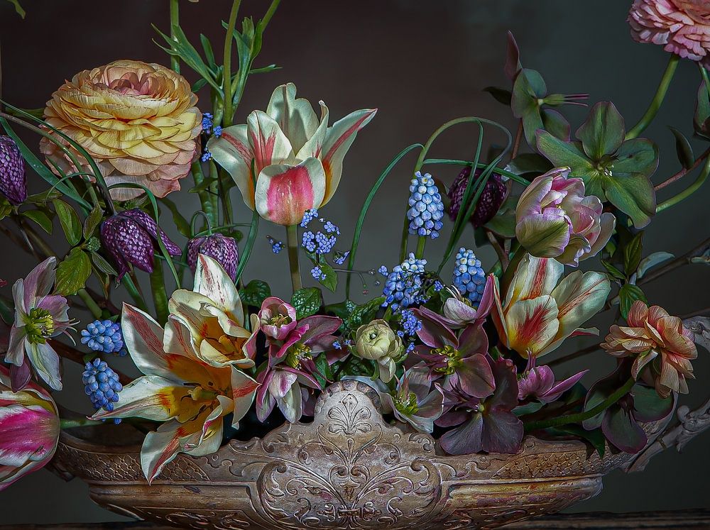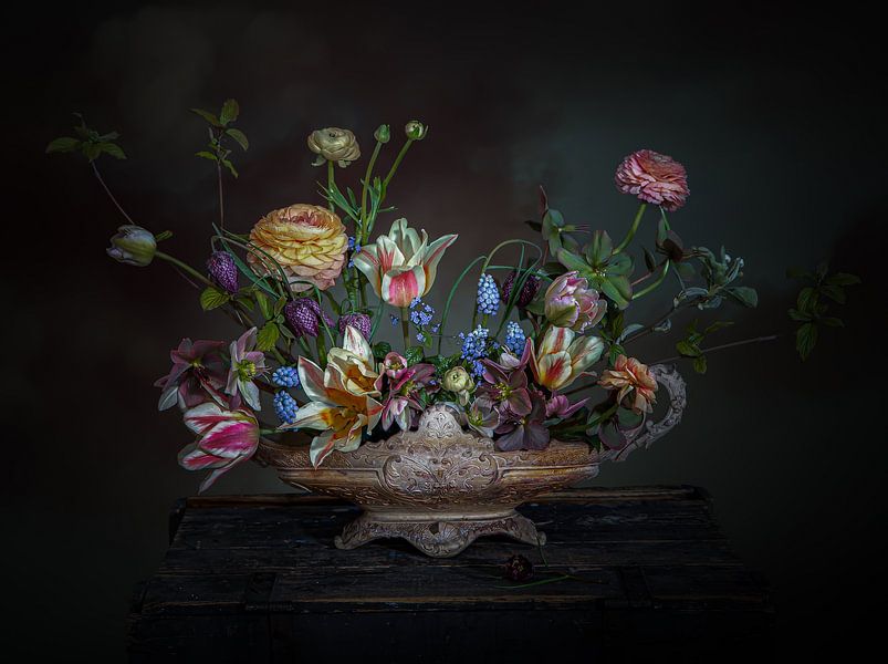 Cette œuvre s'inspire des natures mortes classiques, dans lesquelles les artistes accordaient une grande attention à la beauté, au détail et au symbolisme. On y décèle toutefois une touche de modernité dans la composition ludique et légèrement plus décontractée du bouquet. Elle montre que la nature n'est pas parfaite, mais que c'est précisément là qu'elle trouve sa beauté.