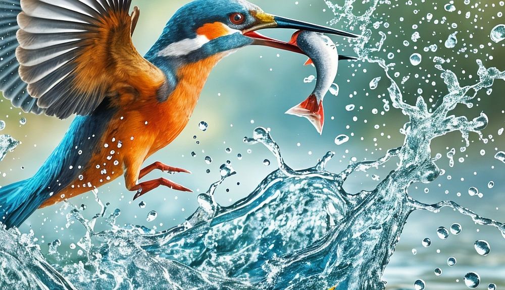 Une image dynamique de la nature : un martin-pêcheur, magnifique dans son plumage chatoyant, perce la surface d'une eau calme avec une précision impressionnante. Son corps est une flèche parfaite qui se dirige avec précision vers sa cible. L'instant est figé : le bec de l'oiseau enserre déjà un poisson qui s'agite et dont le sort vient d'être scellé.