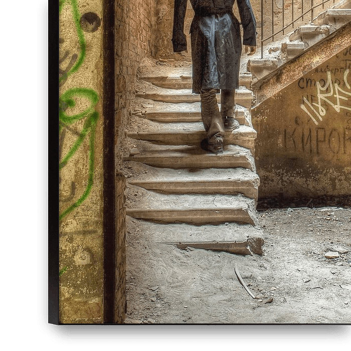 Un homme marchant dans les escaliers d'un bâtiment abandonné