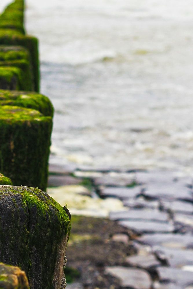 mossige strandpalen in zeeland met uitzicht op de noordzee, in de verte ook nog een aantal boeien in beeld maar door de geringe scherptediepte ontstaat een mooi rustig beeld waarin je kan wegdromen.