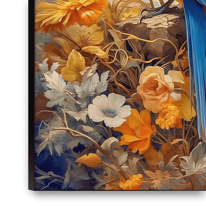 Un oiseau bleu entouré d'un champ de fleurs orange.
