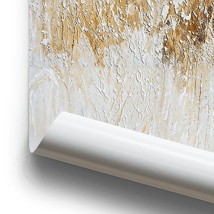 Une abstraction blanche et dorée en format panoramique, noble et sobre. J'ai peint ce tableau sur toile en utilisant la technique de la structure.
