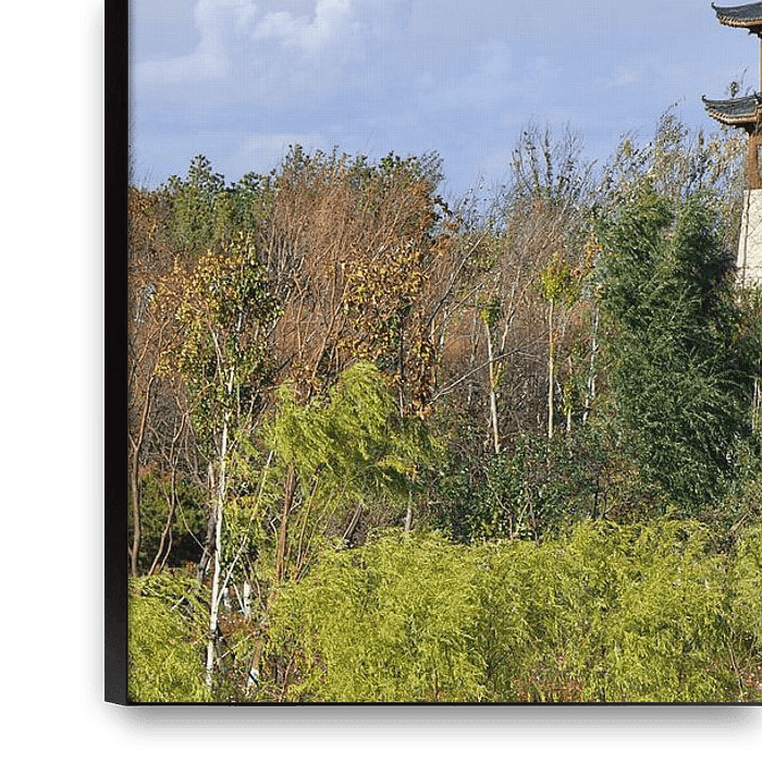 Paysage avec la pagode de style traditionnel, les arbres, le ciel bleu et les nuages dramatiques à Changchun humide des terres, la Chine