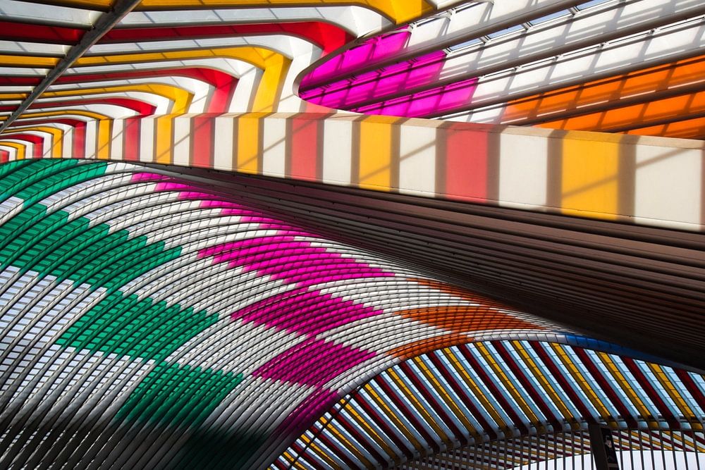 Cette photo colorée a été prise à la gare de Liège-Guillemins. Auparavant, le toit était simplement neutre, mais les couleurs de l'arc-en-ciel y ont été incorporées, ce qui donne une belle chute de lumière lorsque le soleil pénètre dans la gare d'un côté.