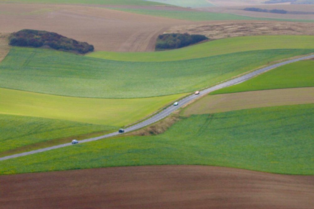 le pays vallonné de la côte française, les différentes couleurs des champs créent une belle image, un des endroits de rêve à voir !