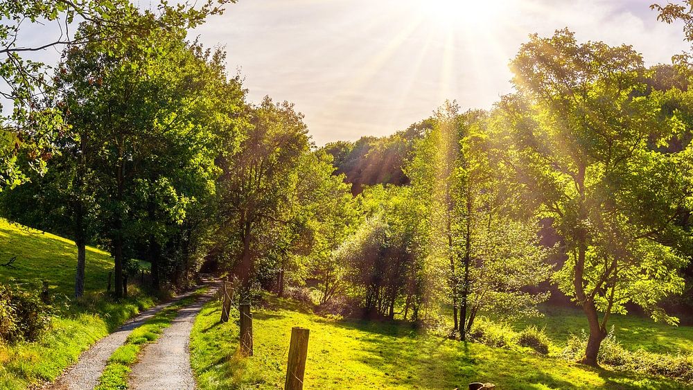 Magnifique paysage en été avec un chemin à travers champs et prairies, avec la forêt et le soleil brillant en arrière-plan.