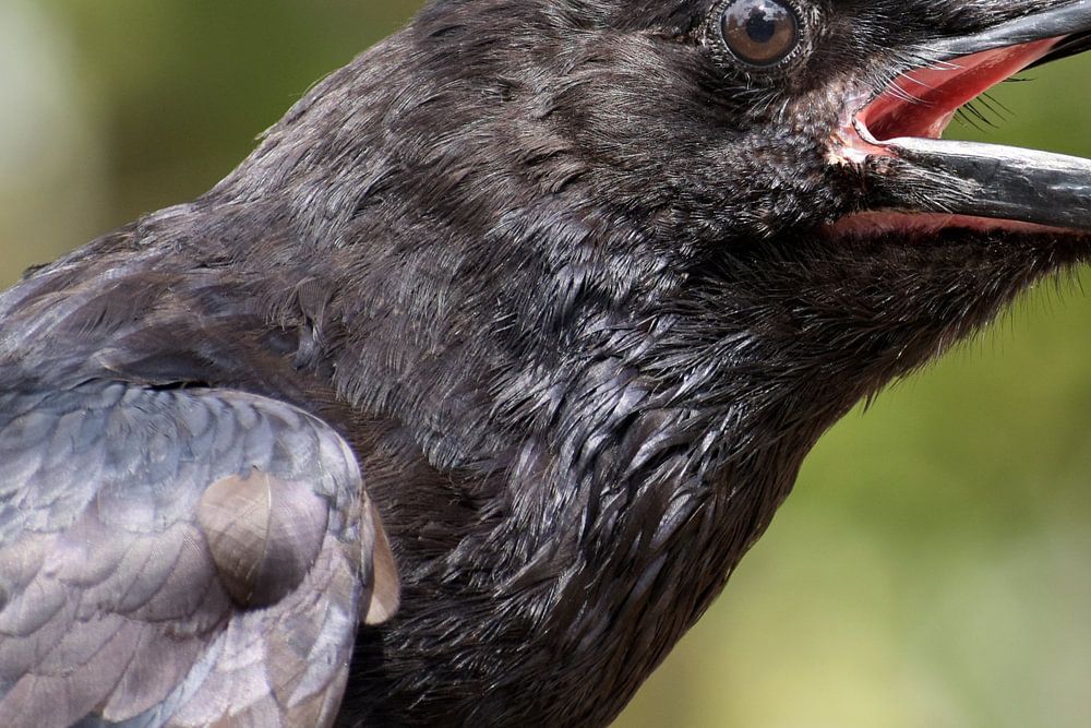 A propos de "portrait d'un jeune corbeau criard (Corvus corax), un grand passereau tout noir, également appelé co"