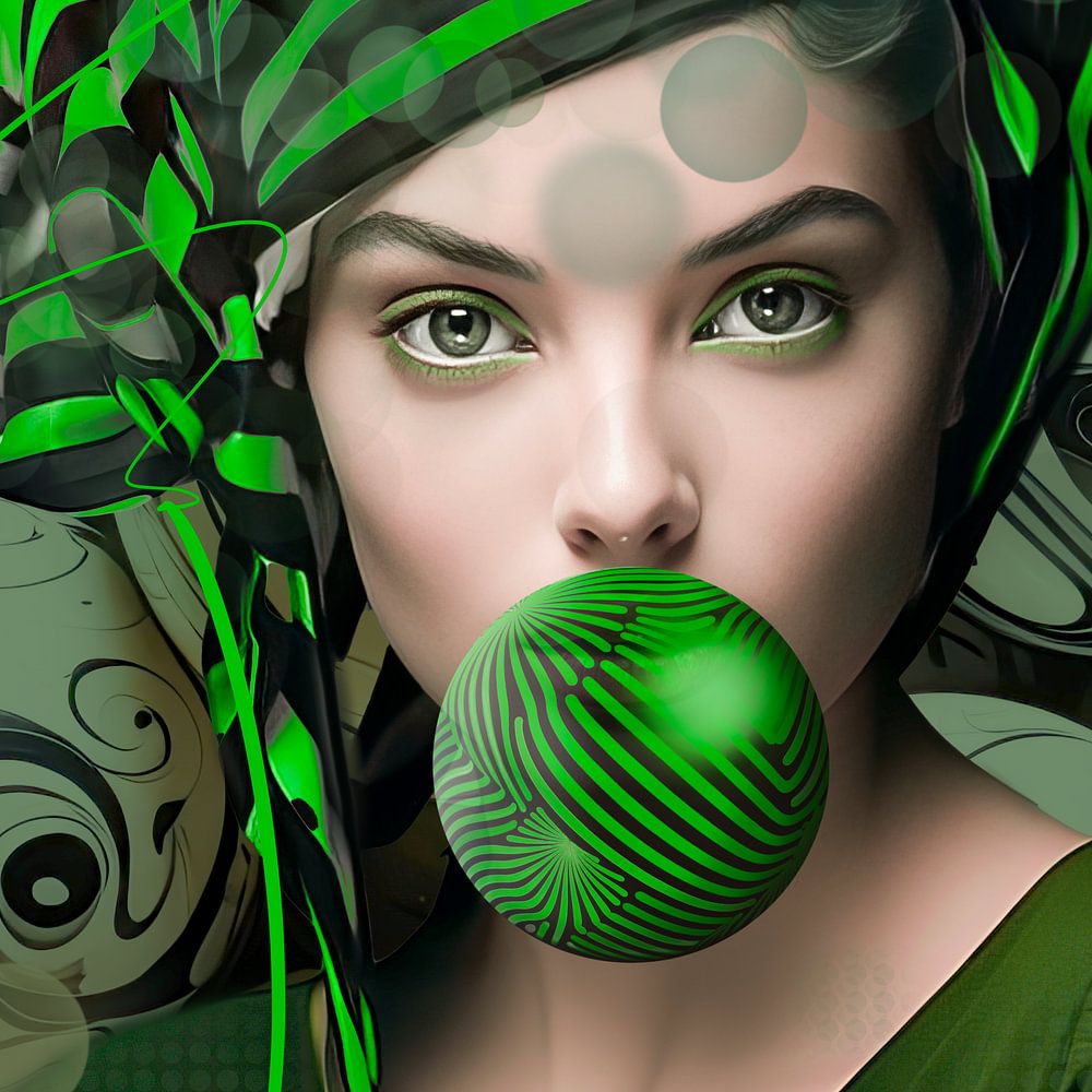 Ma dernière création repose sur le jeu des teintes vertes et des formes géométriques. L'œuvre capture le regard d'une femme, enveloppée dans un foulard vert fluo, qui vous intrigue immédiatement. Ses yeux sont comme les fenêtres d'un monde que l'on veut comprendre. Elle souffle une bulle de chewing-gum dans une nuance de vert unique qui fait ressortir le côté ludique et jeune de la femme.
