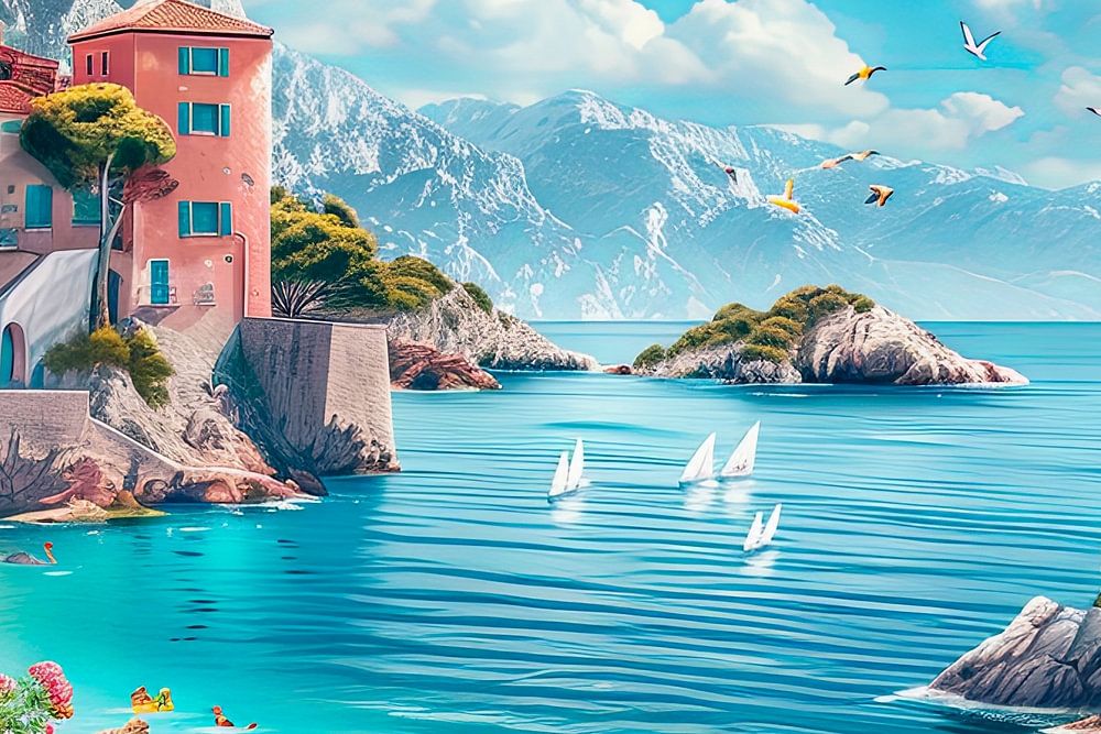 Depuis mon adresse de vacances, j'ai une vue sur un paysage magnifique et étendu qui a un effet apaisant sur moi et me donne un sentiment de liberté et de paix. AI edit