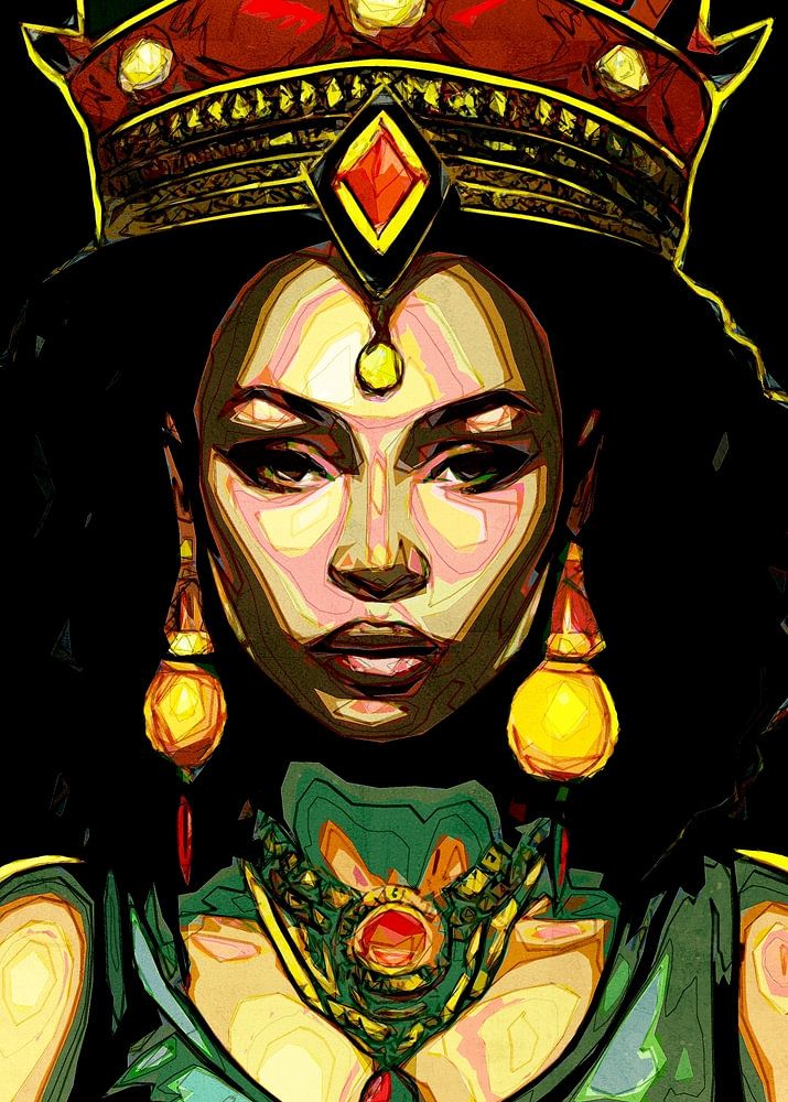une représentation artistique d'une reine parée de bijoux et de vêtements d'inspiration africaine, le drapeau du juneteenth flottant gracieusement derrière elle, symbolisant son lien royal avec l'événement historique.