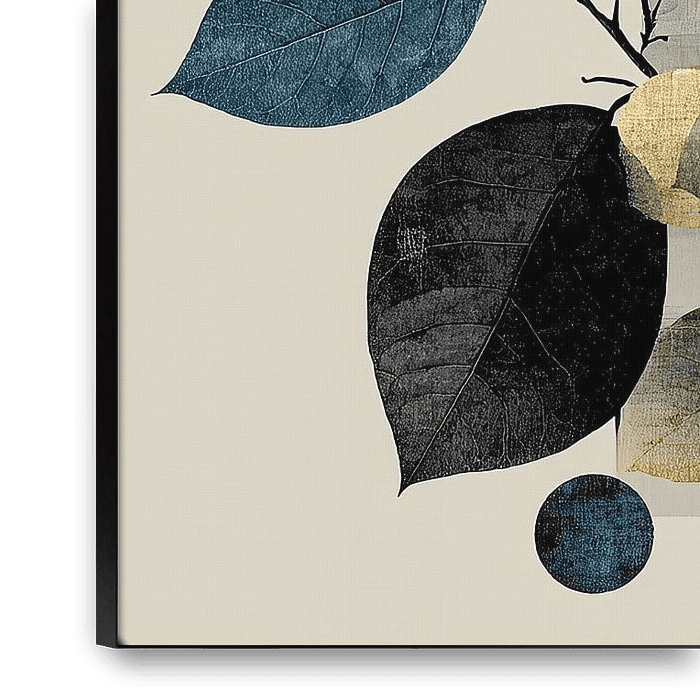 Urban Nature''s Calm Vibes - Cette peinture botanique représente une branche avec des feuilles et des baies dans différentes nuances de bleu, associées à des formes abstraites dorées et grises, créant un effet moderne dans un style minimaliste.