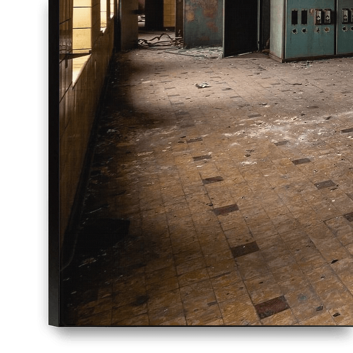 Salle de contrôle verte abandonnée à l'intérieur d'une ancienne usine.