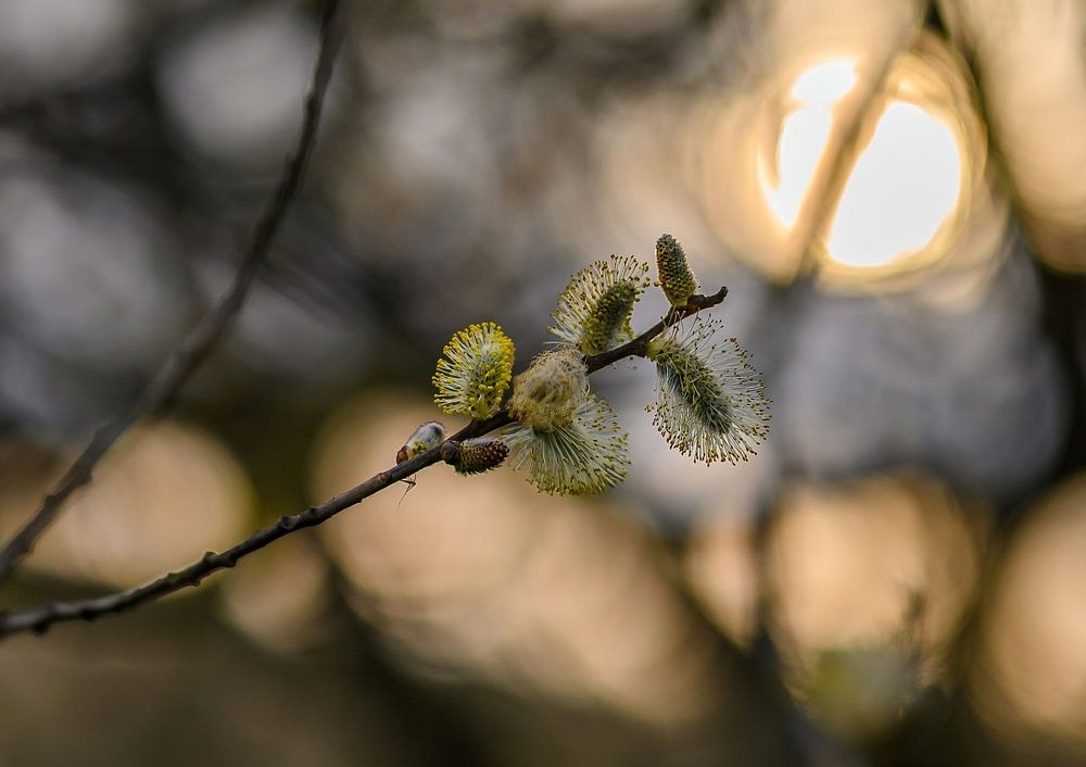 gros plan d'une branche avec des brindilles de saule, avec un fond bokeh doré à cause du soleil couchant