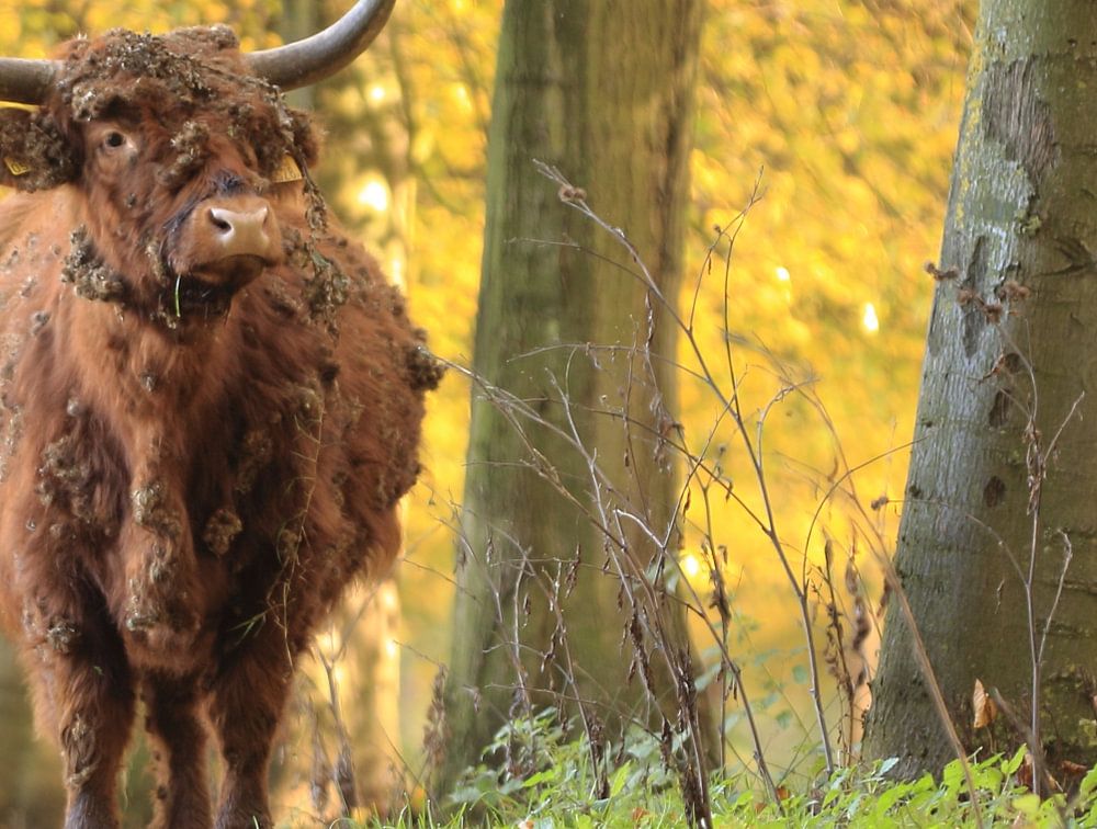 schotse hooglander in herfstkleuren, gekozen voor een zo,n laag mogelijk standpunt om de gele herfst bladeren zoveel mogelijk te laten spreken.