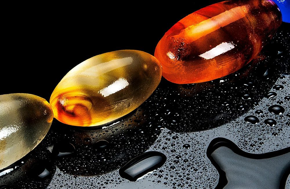Six pierres de verre sur une assiette noire avec de l'eau devant elles.