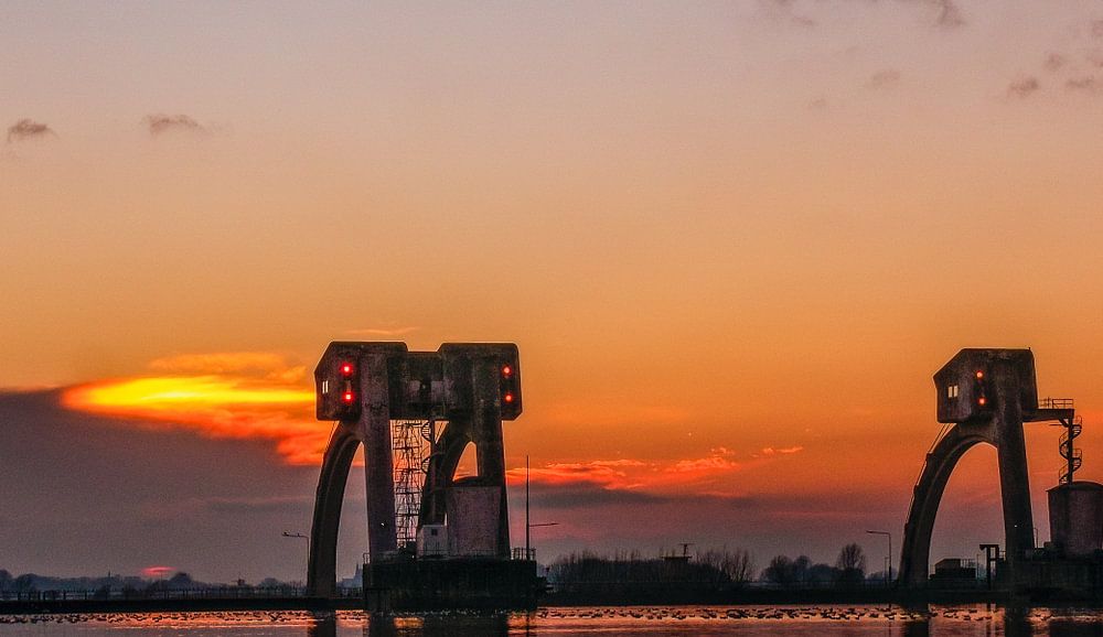 Ondergaande zon geeft een oranje gloed. De ondergaande zon is achter de wolken. de stuw en de hemel wordt weerspiegelt in het water van de rivier.