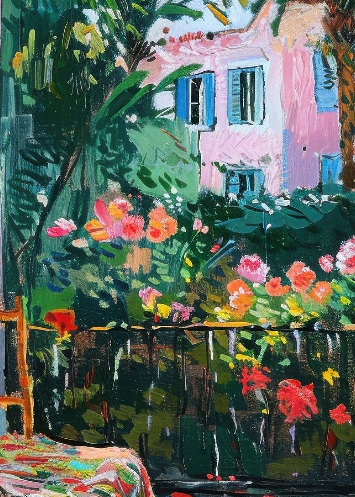 Cette œuvre d'art aux couleurs vives montre une terrasse ouverte avec une grande fenêtre - inspirée par le style unique d'Henri Matisse. Dehors, une chaise aux motifs floraux en tissu invite à la détente. Par la fenêtre, on aperçoit une maison rose, entourée de manière charmante de verdure tropicale, de palmiers et de fleurs rouge vif.