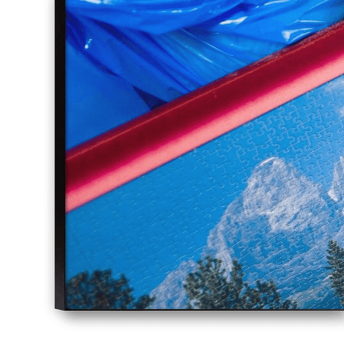 Bruxelles Belgique 2016 quelque part dans une maison je suis tombé sur cette situation . une photo d'un paysage de montagne quelque part en Autriche, dans un grenier avec couverture, oreiller, sacs, rideau. Une image troublante, beaucoup de plastique et de matières plastiques, le souvenir du voyage.